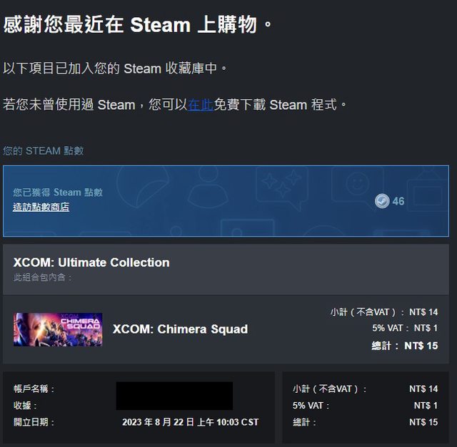 好香的價格不買嗎? 其實我一代二代都買過組合包了 只剩下 XCOM: Chimera Squad 這套還沒收 一方面沒時間玩一方面看評論褒貶不一 75%的時候也沒吸引我過 剛剛看到信件通知說85%了只要89元 想說一個便當而已就買吧,結果點進去看到91%的組合包 扣掉原本已經有的內容後結帳只花了15元就得到Chimera Squad 爽啦! 附上購買證明 https://i.imgur.com/EqoLczj.jpeg