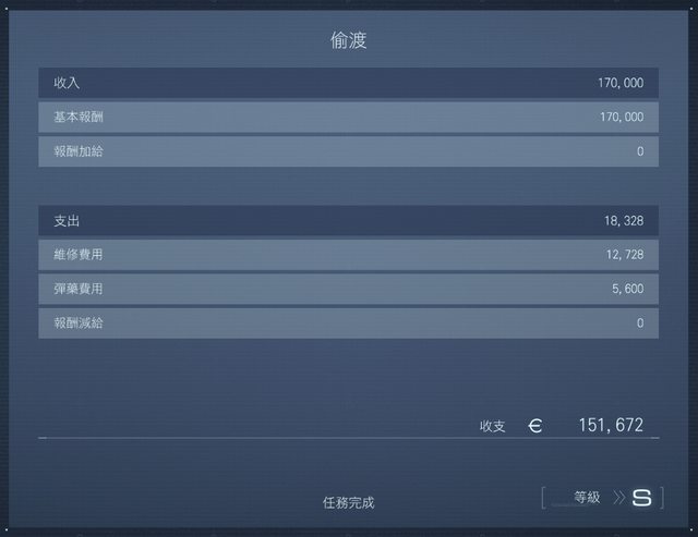 先說結論: 必須不接關的情況,優先達成關卡特殊條件, 然後盡量快>>>省成本。 逐條分析: 1. 不要出包(死亡),這是硬條件。 2. 要揣測上意,雖然簡報裡有提到的額外條件或戰鬥中突發的事件都是可選擇的,不過業主會提就是代表很在意,沒有明說可是你要懂。(這點很幹的是教學裡也沒講) 3. 快才是業主要的,你在不出包又滿足業主的情況下,能多快就多快。 4. 花多少成本其實業主不是很在意,他只付你固定報酬,成本那是你家的事。 我下午把幾個前期的任務都刷了S, 比如任務01,有最小限度打完整場不吃補的,有全殲敵人的,最高都只有A。 而直接衝三個屍體偷證件,偷完跳電梯打飛機,上去貼臉八刀硬剛導致吃了一個補包,這樣很醜的玩法卻有S。 https://i.imgur.com/jHal8uJ.png