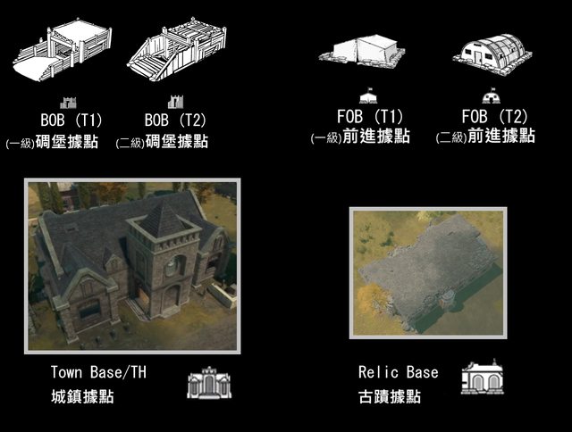 : : 常見的據點類型有 - 碉堡據點 BOB、 前進據點 FOB、 城鎮據點 TH(Town Base)、