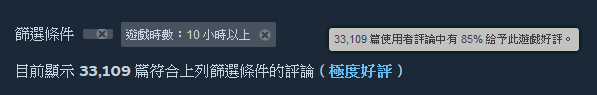 → jqs8ah5ar: 給評玩家有接近一半玩超過10小時以上,評價85% 11/30 21:32
