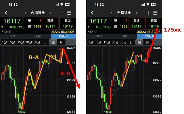 : 右邊是說目前走簡單的對稱,突破盤整區間,保守上看17xxx