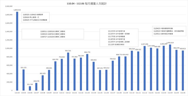 110年4月後每月運量人次統計: