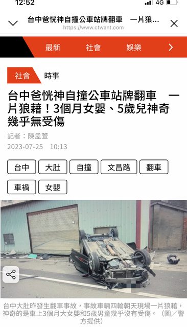 推 chiyuan : 不是被側撞造成翻車應該對車內乘客都還好 重要的是 07/26 09:32