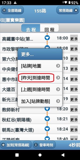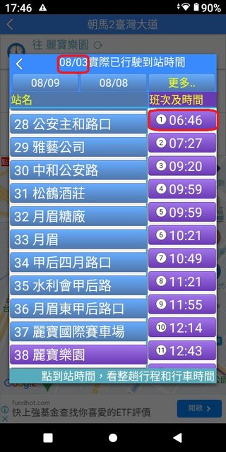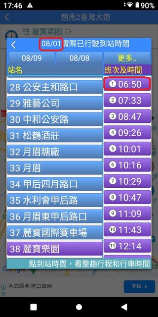 朝馬 6:03 麗寶 6:51 加減得知朝馬到麗寶,約48分鐘。 3.複雜版APP--台中公車何時來