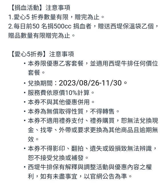 1.活動期間前往指定捐血點,完成捐血者,贈西堤牛排單客套餐愛心5折券乙張。