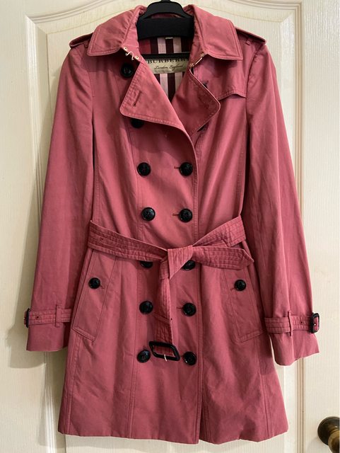 36號 穿著少於10次 很新 已送乾洗 毛90% 毛領是兔毛 很柔軟 有別於一般市面 毛領可拆 袖子可反摺 每顆釦子都有加強釦固定 內裡是經典格紋 5.Burberry 玫瑰粉中長風衣 7998含店到店運費(可全家 萊爾富 OK 取貨)