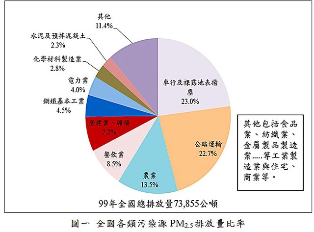 依圖一所示,全國各類污染源PM2.5排放量比率分別為車行及裸露地表揚塵23%、公路運輸