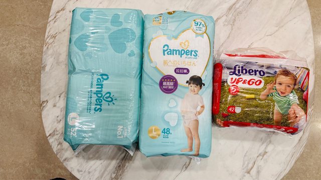 幫寶適黏貼型(52片)、幫寶適拉拉褲(48片)、麗貝樂拉拉褲(42片)
