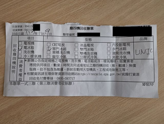 標題[交易] <冰箱>廢四機回收聯單 已售