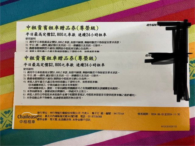 中租租車券 600元/1張,1000元/2張