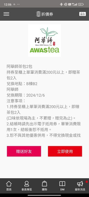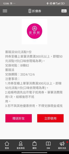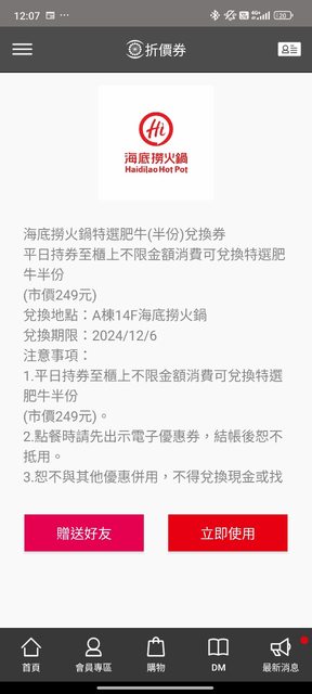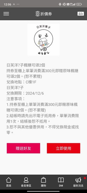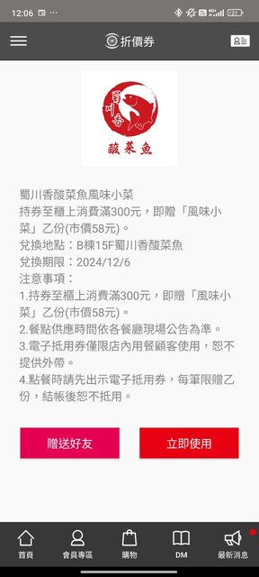 物品名稱:中友百貨優惠電子券 物品實照:見截圖 贈送規則: 1. 須有下載中友app 2. 請站內信告知需要哪一項,確定贈與會回覆,再提供手機電話。 3. 確定會使用者再來信索取。 4. 只回覆受贈者。