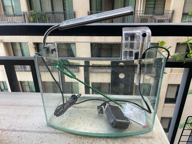 1. 洽中,魚缸(含外掛馬達、燈具、漁網)17*21*30 150元