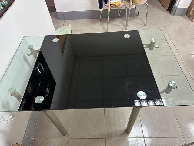 尺寸137*81*76 桌腳稍微偏移,可自行上膠補強,兩側透明玻璃可收起,桌腳可拆卸