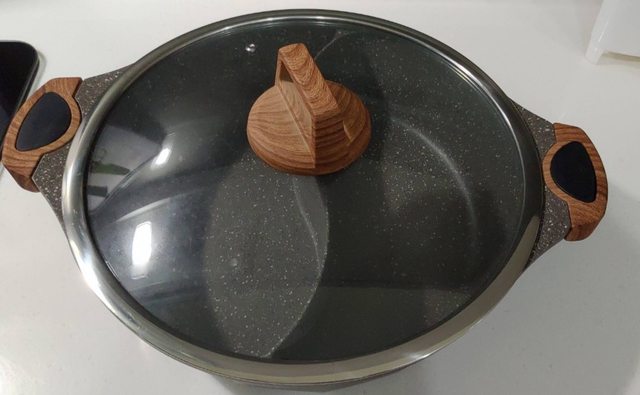 3、鍋寶 鑄造大理石不沾鴛鴦鍋: 售1,000元。(買來只用過2次,鍋身:高級複合金+食品級不沾材質(耐熱260度);鍋蓋:強化玻璃;容量: 約5L±5%;尺寸: 約長39.6x寬31.2x高15.3cm±5%;詳細介紹可上網搜尋)