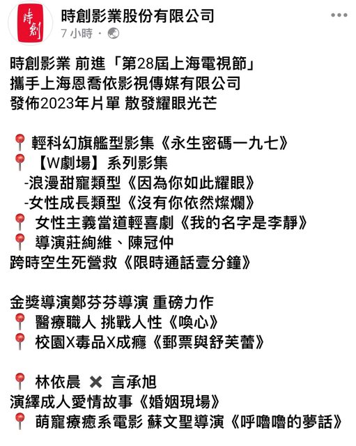 時創影業日前在「第28屆上海電視節」發佈2023至2024年片單,包括輕科幻旗艦型影集《