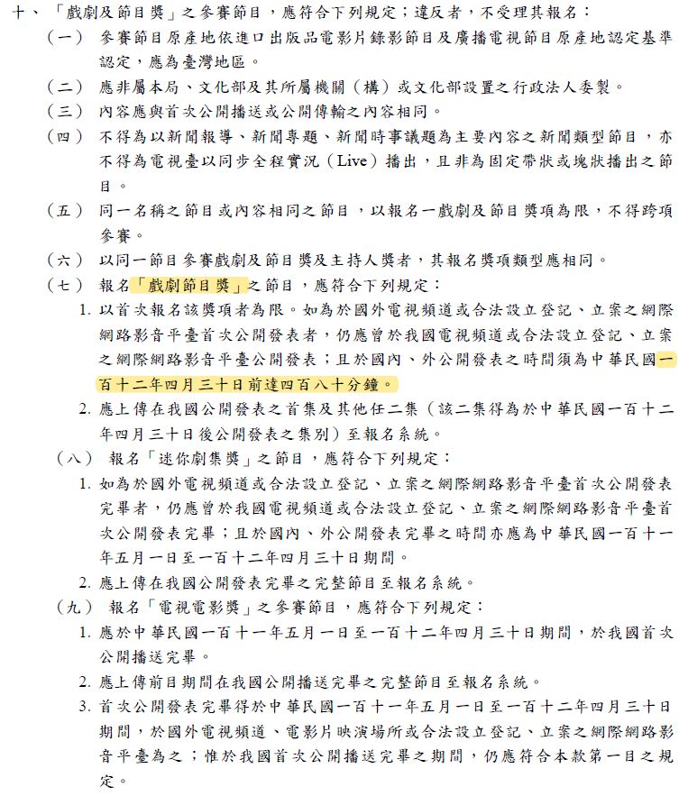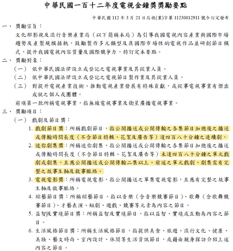 節目類及迷你劇集類分開討論,界線依照金鐘辦法的規定就是480分鐘不含廣告,今年是