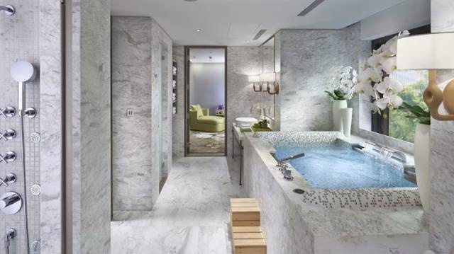 步入式衣櫃間,浴室則採用豪華大理石的經典設計,配備步入式淋浴間和獨立浴缸。