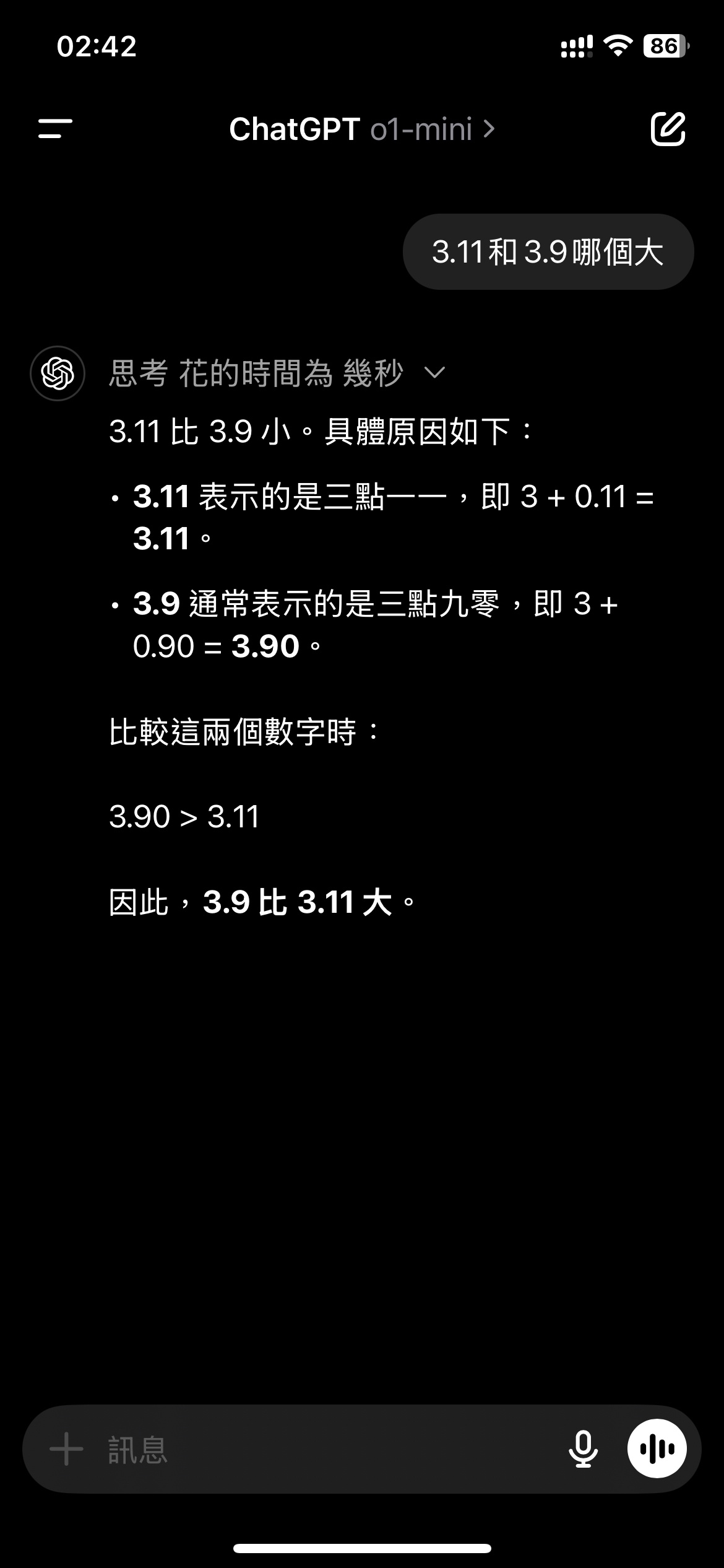 噓 NexusPrime : 我問ChatGPT 是 3.9 > 3.11 49.229.180.140 01/29 12:51