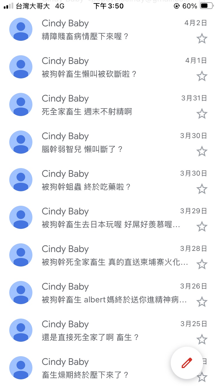 → luckyalbert : 團的畜牲孽種少來煩我,不然你自己 49.216.48.218 04/04 17:59