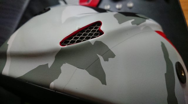 而上方從側面一直延伸到後方紅色區域, 主要的修飾只有這個應該就亂畫的圖案? 至少我看不出來代表什麼,圖案左右都是相同的。 同時這邊也可以看到後方的排氣口以及側面的帽簷鎖點。