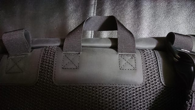 最上方中央是提把的設計,兩側則是各有一個織帶。