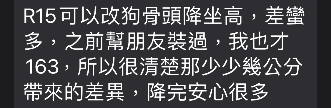 → jhengME: 幫你查了,nsr座高:77公分 r15座高:81公 182.233.4.184 06/16 00:28