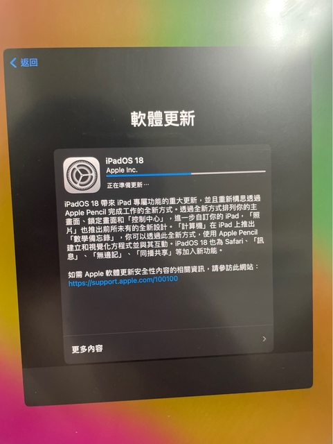 剛購入的新機在設定時一直卡在更新iPadOS 18的畫面,重新開機還是遇到一樣問題也無