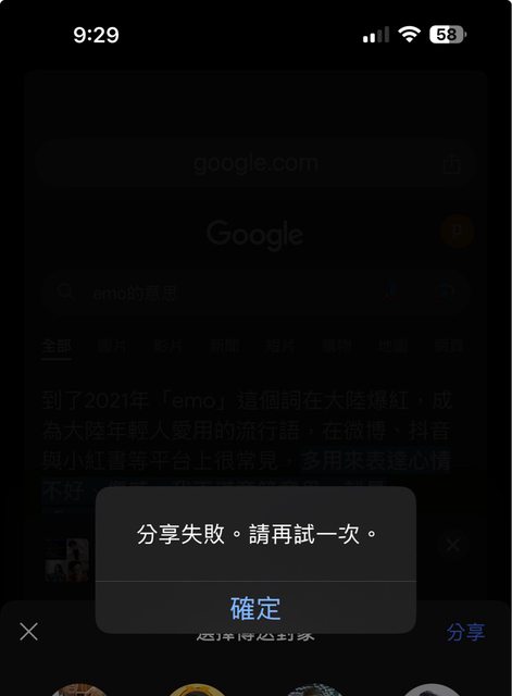 我看到網頁,想分享給line的朋友,點選網頁的分享,選擇朋友,按下分享,卻出現以下