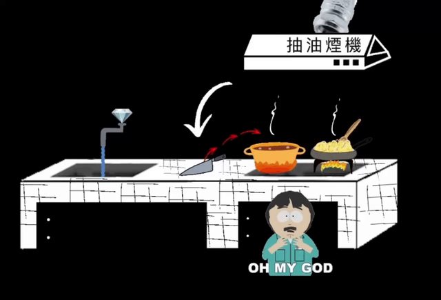 整場意外沒有人碰到掉下來的抽油煙機和彈起來的菜刀