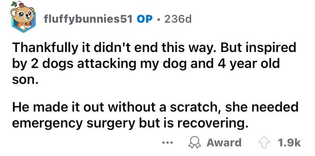 推 ainamk: 4是有狗要攻擊敘事者的小孩 敘事想阻止狗攻擊但跑得不夠快05/25 17:47