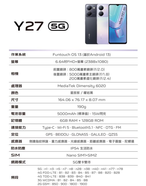 欲售物品: VIVO Y27 5G 曜岩黑 (6G/128G)