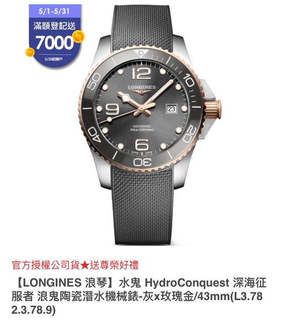 品牌名稱:浪琴 深海征服者 灰玫瑰金