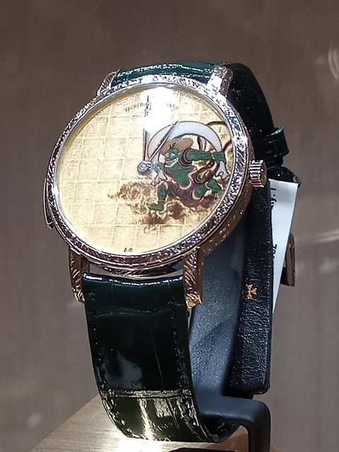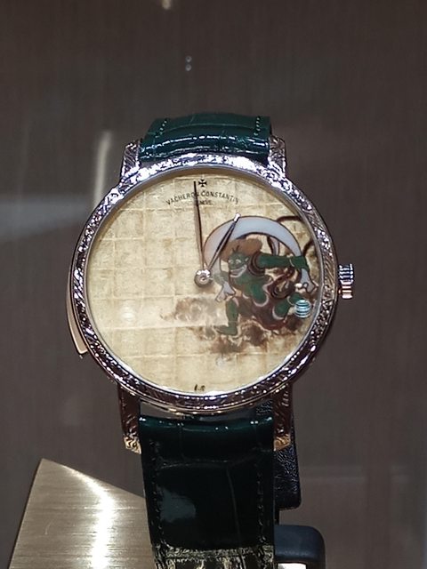 這一次的風神雷神截然不同,在神韻的勾勒上可謂是維妙維肖,風神雙手抓著包袱巾乘風而來,雷神拿著棒子準備敲擊引電。錶盤的格狀是還原屏風的格子框的樣子。整體的釉料色彩金工可謂是技術上乘。